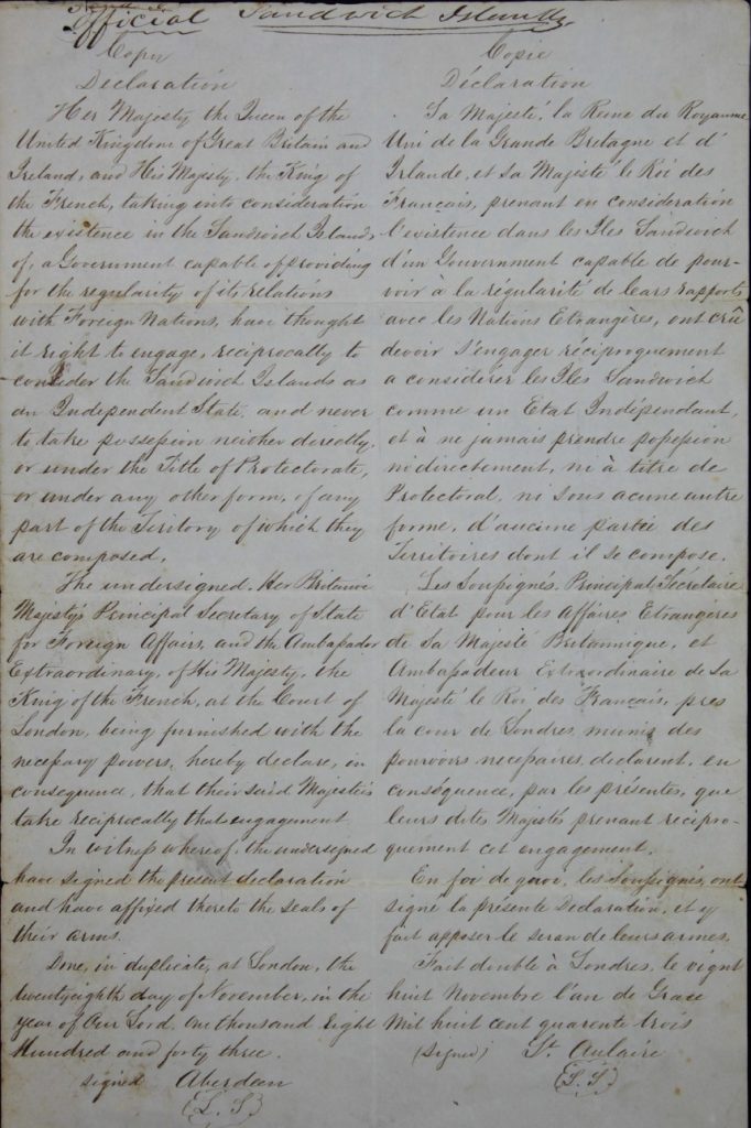 The British and French governments formally recognized the Hawaiian Kingdom’s independence in a joint declaration signed by Lord Aberdeen and the Comte de Saint-Aulare, representatives of Queen Victoria and King Louis-Phillippe. A transcription of the English declaration is provided below.