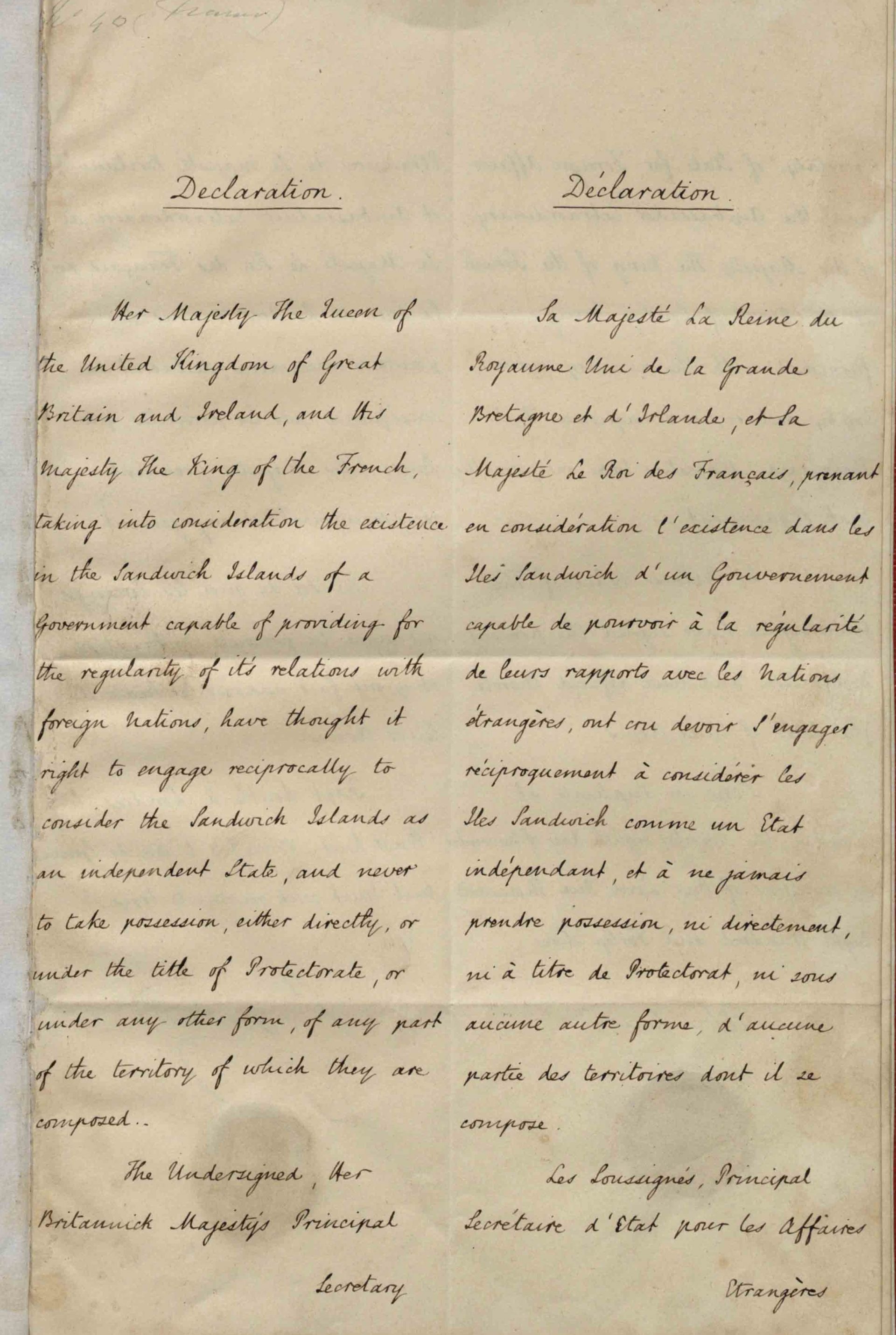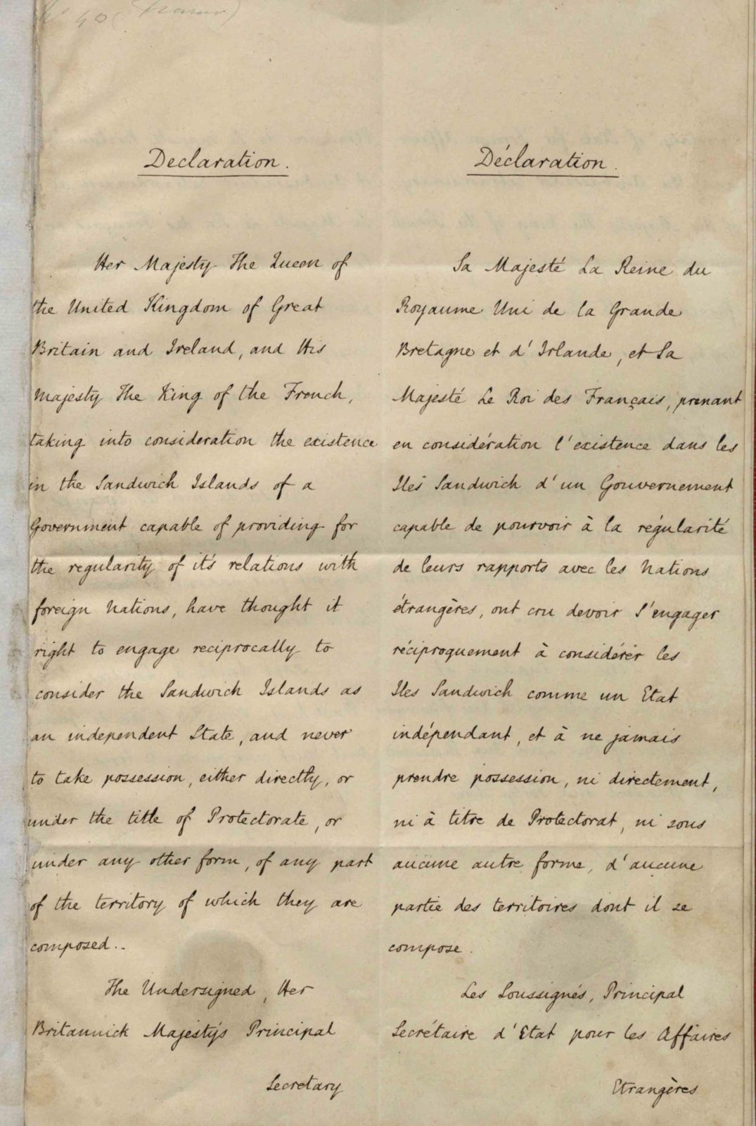 Her Majesty the Queen of the United Kingdom of Great Britain and Ireland, and His Majesty, the King of the French, taking into consideration the existence in the Sandwich Islands of a Government capable of providing for the regularity of its relations with Foreign Nations, have thought it right to engage, reciprocally to consider the Sandwich Islands as an Independent State, and never to take possession neither directly or under the Title of Protectorate, or under any other form, of any part of the Teritory [sic] of which they are composed.