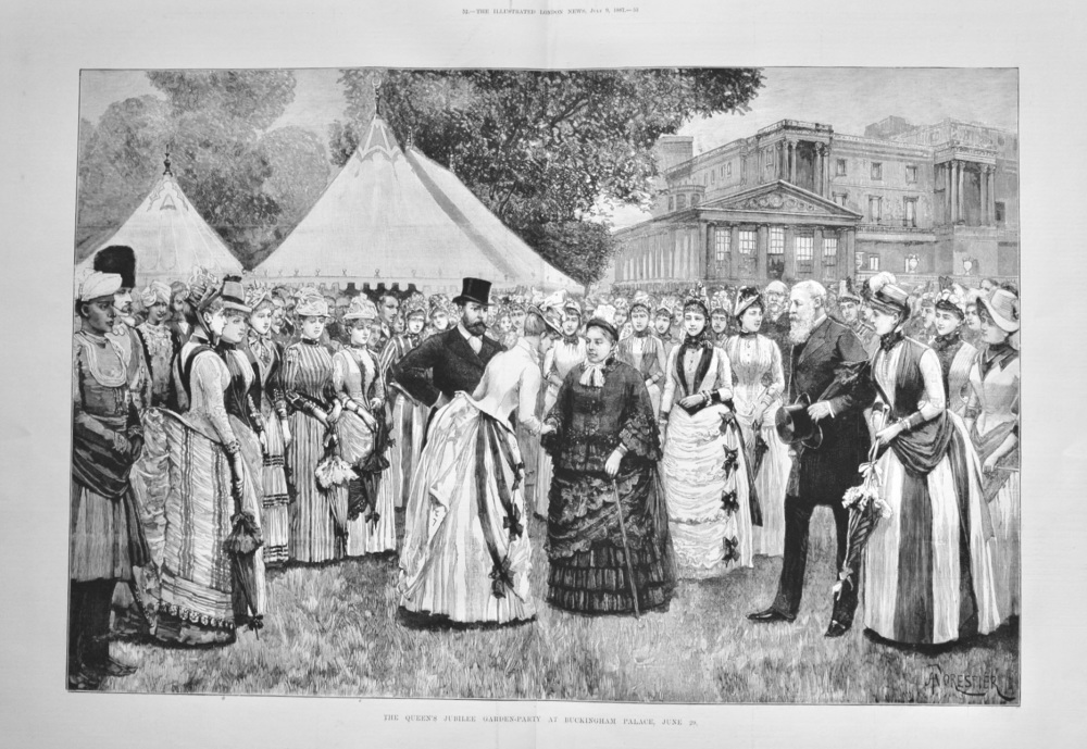 THE final entertainment, given to the party of royal visitors from all quarters of the globe, was a garden party, tendered by Her Majesty Queen Victoria, at which she herself and all her good and beautiful children were present. Punctually at the appointed hour the Queen of England, attended by the heir apparent to the throne, H. R. H, the Prince of Wales, accompanied by the princess, his lovely wife, made their appearance; following them came the other members of the royal family. The procession moved along the gravelled walks of the palace garden, led by the great and good lady whose jubilee year we were celebrating. It was made up of kings and queens, princes and princesses, from most of the reigning families of the world; on each side of us as we passed stood the crowds of eager and respectful observers; the greensward in the gardens at each side of the walk was a solid mass of people. These were of many ranks and conditions in life, and principally persons of note. Among them were well-known actors and celebrated actresses; naval officers, and other holders of official positions; representatives of almost every class over whom the good queen rules. Here and there, as we advanced, were heard strains of music, tents having been erected for the accommodation of the bands which were in service for the day. I think there were four of these at different points in our march, each composed of the best and most skilful musicians that could be enlisted for the occasion.