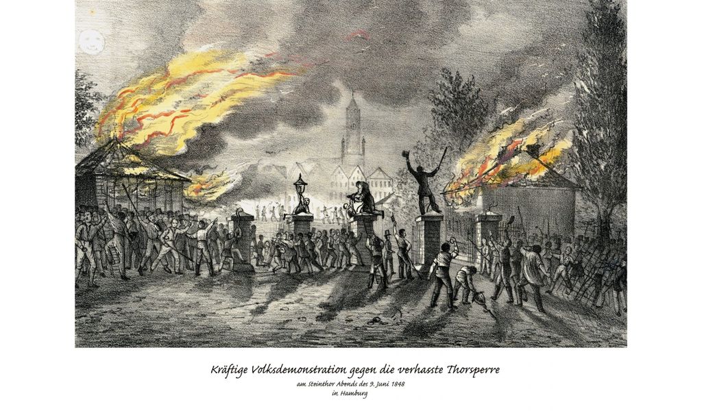 So hatte man in Deutschland Angst, dass dieser Funke auch zu ihnen überspringt. Wie im Rest von Europa waren die Bürger von Hamburg zu tiefst unzufrieden. Die 150‘000 Einwohner, welche in unmenschlichen Bedingungen und unvorstellbare schlimmen hygienischen Zustände lebten, hatten kein Recht sich für ihre Zukunft politisch zu äussern oder mitzubestimmen. Alleine die Reichen hatten das politische Mitbestimmungsrecht, die 3‘000 „erbgesessenen Bürger“ nämlich, also diejenigen, die über Grundbesitz innerhalb von Hamburgs Wallanlagen verfügten. Bei den Einwohnern in Hamburg brodelte es von Unmut welches am Freitag, 3. März 1848 zur Explosion und Aufstand kam. Die Bürger akzeptierten nicht mehr länger, dass alleine die Reichen das Sagen haben. Die Senatoren von Hamburg spürten die Tumulte an ihren prächtigen Villas, die durch das arme Volk mit Steinen die Fenster eingeschmissen wurden. Das Bürgermilitär musste einschreiten um die Tumulte unter Kontrolle zu bringen und eindämmen. Noch am selben Abend des 3. März 1848 wurde eine Ratssitzung in Hamburg einberufen, um zu beraten wie das Volk beruhigt werden kann. Der Vorschlag war die Pressefreiheit einzuführen, um der Hauptforderung der Opposition zu erfüllen.