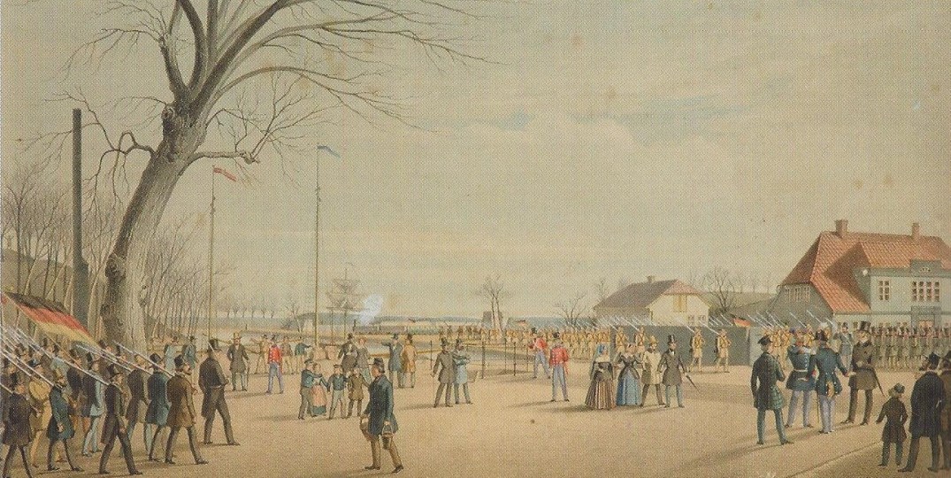 Am 9. April 1848 entbrannt bei Flensburg ein erster militärischer deutsch-dänische Konflikt der Neuzeit aus, welcher auch unter den Namen „Schleswigscher Krieg“ oder „Schleswig-Holsteinische Erhebung“ bekannt ist. An diesem Tag erwarten ungefähr 5‘000 schlecht ausgerüstete Soldaten und freiwillige Kämpfer von Studenten und Turnen der Schleswig-Holsteinischen Truppen bei Flensburg einen Aufmarsch gegenüber von 11‘000 gut ausgebildeten Gardehusaren, Dragoner, Jägerkorps und Infanterie der Dänen an. Die Dänen sind mit mehreren schweren Kanonen ausgerüstet anmarschiert sowie liegen vor der Küste bei Förde fünf dänische Kriegsschiffe mit mehreren Kanonenboote vor Anker. Doch die Truppe der Freiwilligen und Aufständischen der Schleswig-Holsteinisch sind den gut ausgerüsteten Dänen bei der Schlacht nicht gewachsen und müssen sich nach paar Stunden Gefecht in die Festung Rendsburg zurückziehen. Ein Teil der Truppen geriet in dänische Gefangenschaft. Die Dänen besetzt somit das Herzogtum Schleswig bis zur Eider.