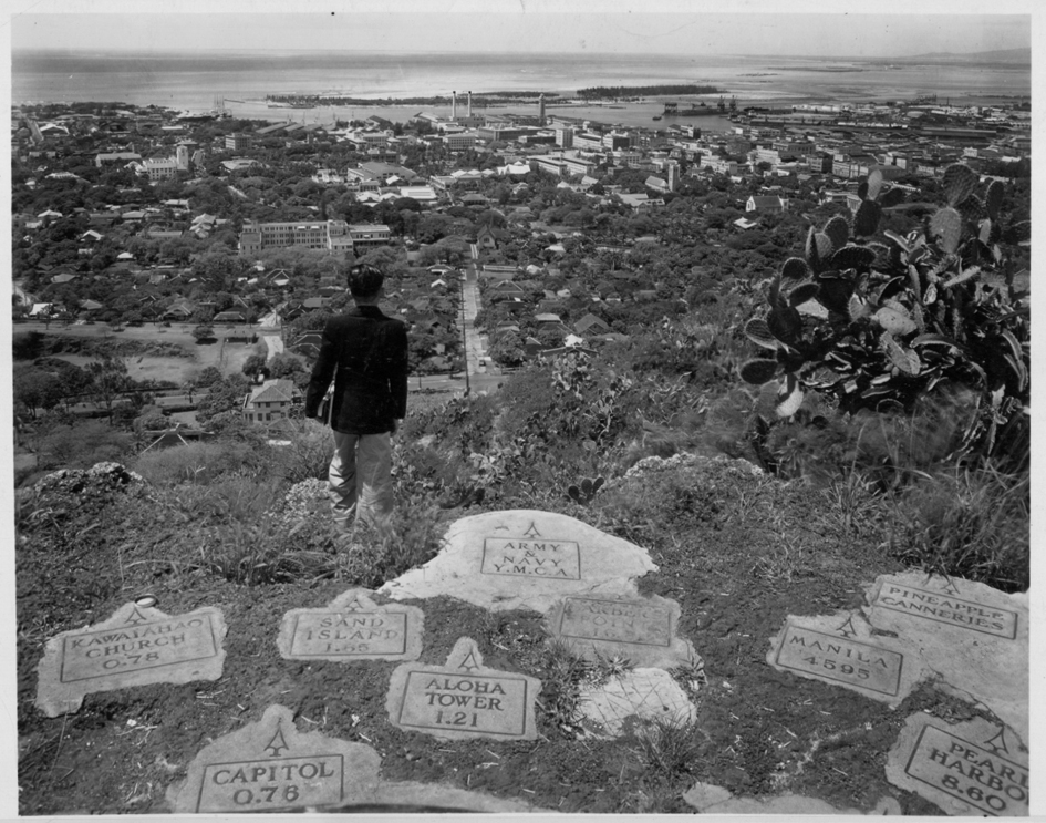 In the morning, after the army had gone, Kalelealuaka said to his wives, “I am thirsting for some water taken with the snout of the calabash held downward. I shall not relish it if it is taken with the snout turned up.” Now, Kalelealuaka knew that they could not fill the calabash if held this way, but he resorted to this artifice to present the two young women from knowing of his miraculous flight to the battle. As soon as the young women had got out of sight he hastened to Waialua and arrayed himself in the rough and shaggy wreaths of uki from the lagoons of Ukoa and of hinahina from Kealia. Thus arrayed, he alighted behind the lame marshal as he climbed the hill at Napeha, slapped him on the back, exchanged greetings with him, and received a compliment on his speed; and when asked whence he came, he answered from Waialua. The shrewd, observant cripple recognized the wreaths as being those of Waialua, but he did not recognize the man, for the wreaths with which Kalelealuaka had decorated himself were of such a color—brownish gray—as to give him the appearance of a man of middle age. He lifted the cripple as before, and set him down on the brow of Puowaina (Punch Bowl Hill), and received from the grateful cripple, as a reward for his service, all the land of Waialua for his own.