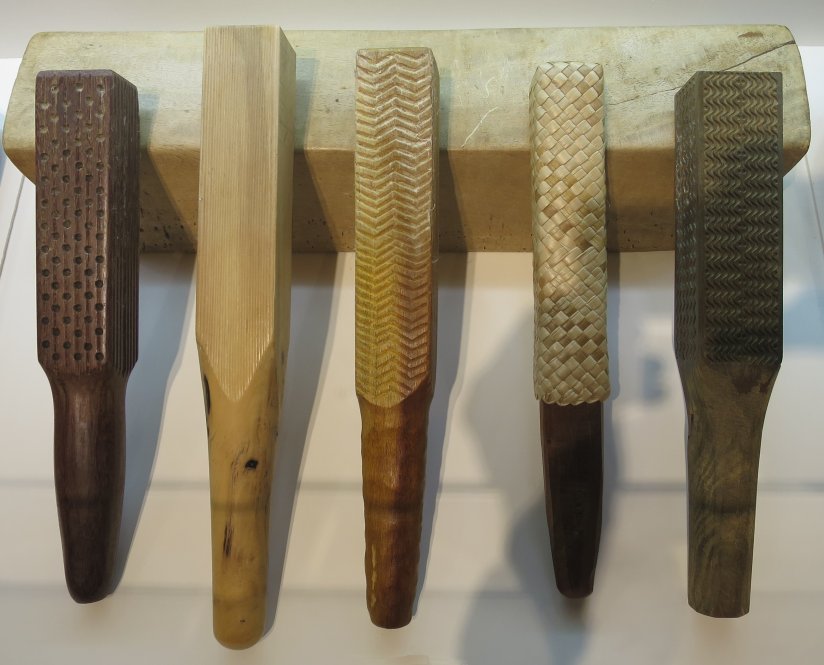 The other daughter, Laa-hana, was also worshipped as an aumakua by those who used especially marked clubs while beating the bark into patterns or marked lines, for they said she learned how to scratch the clubs with sharks’ teeth so that marks would be left in the pounded sheets. She was also able to teach those who worshipped her to mark figures or patterns on the pounded kapa.