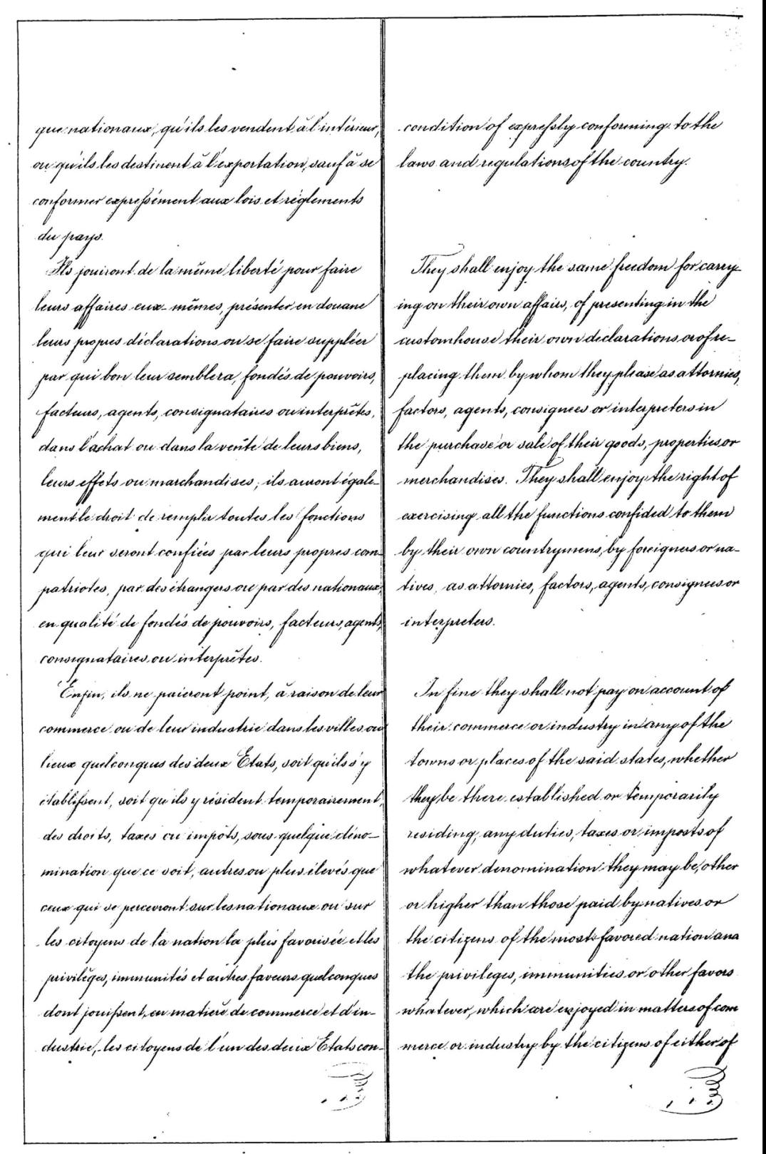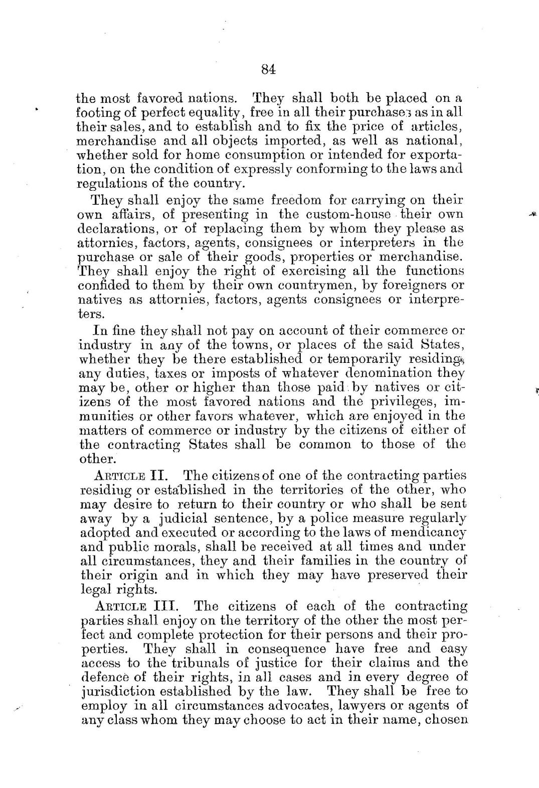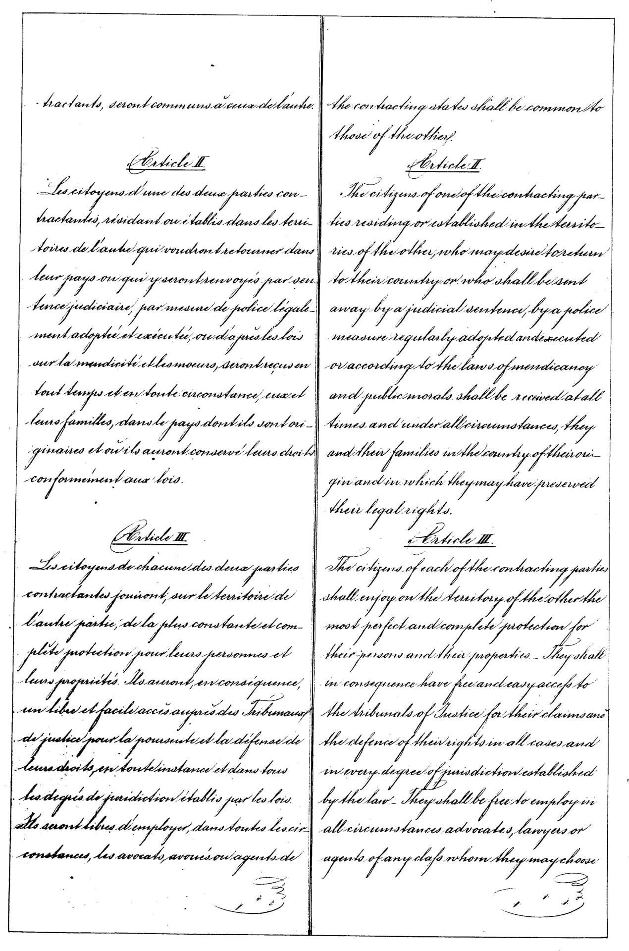 Die beiden kontrahirenden Theile verpflichten sich, die beidseitigen Bürger in allem, was die Einfuhr, die Niederlage, den Transit und die