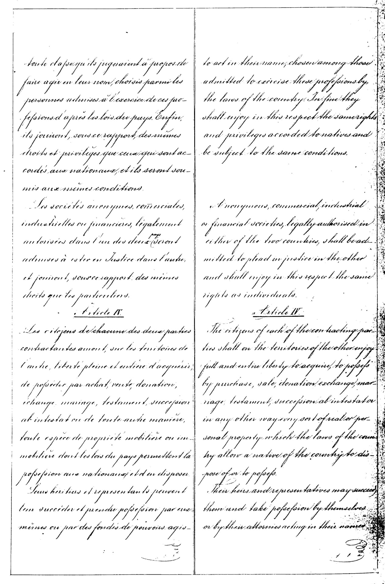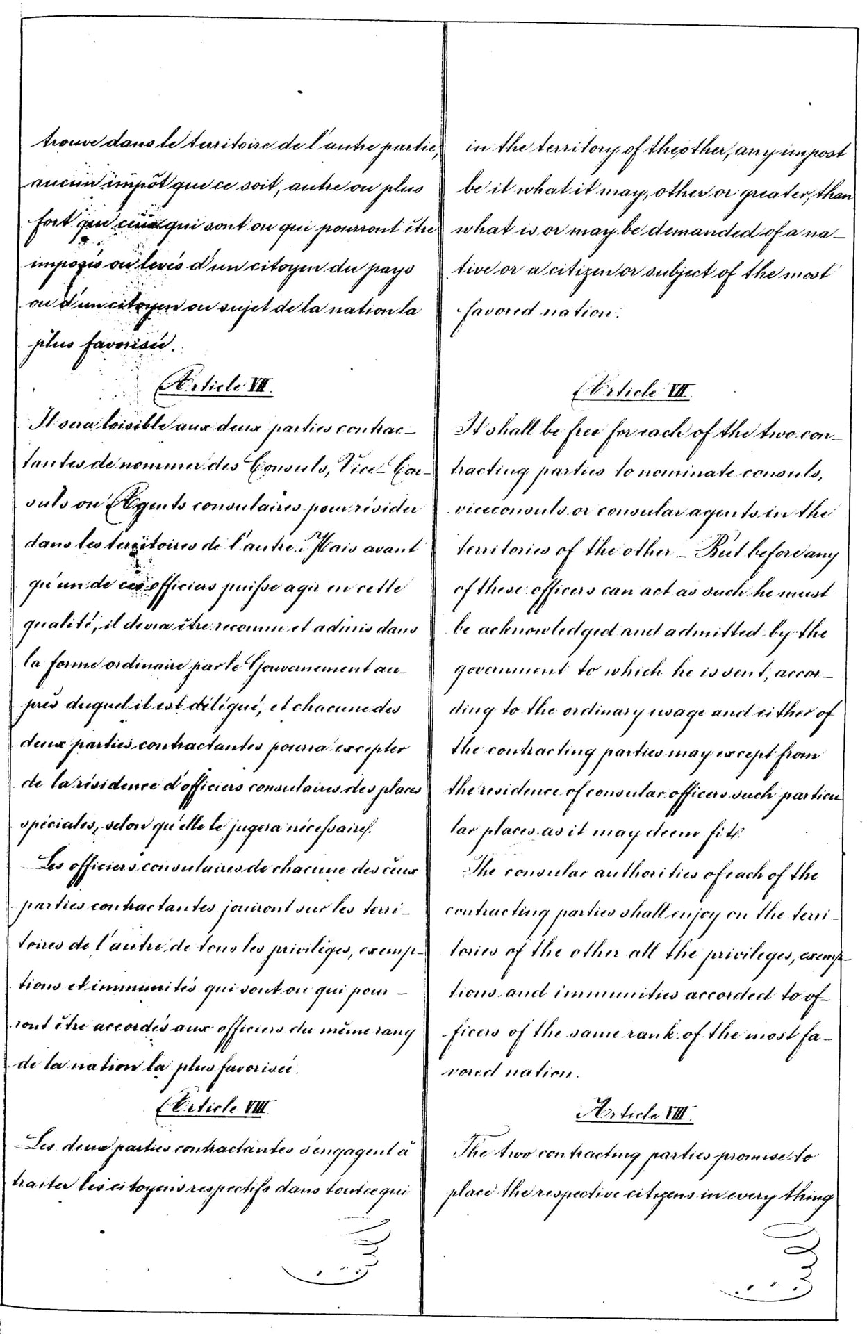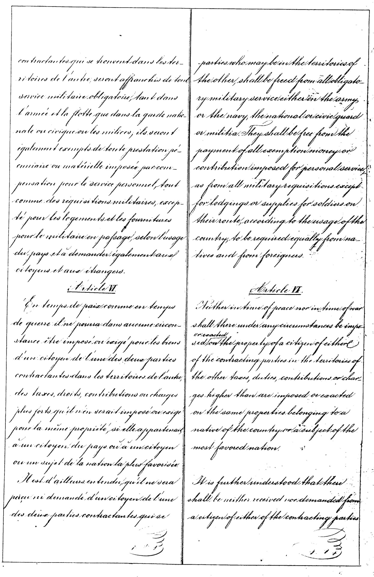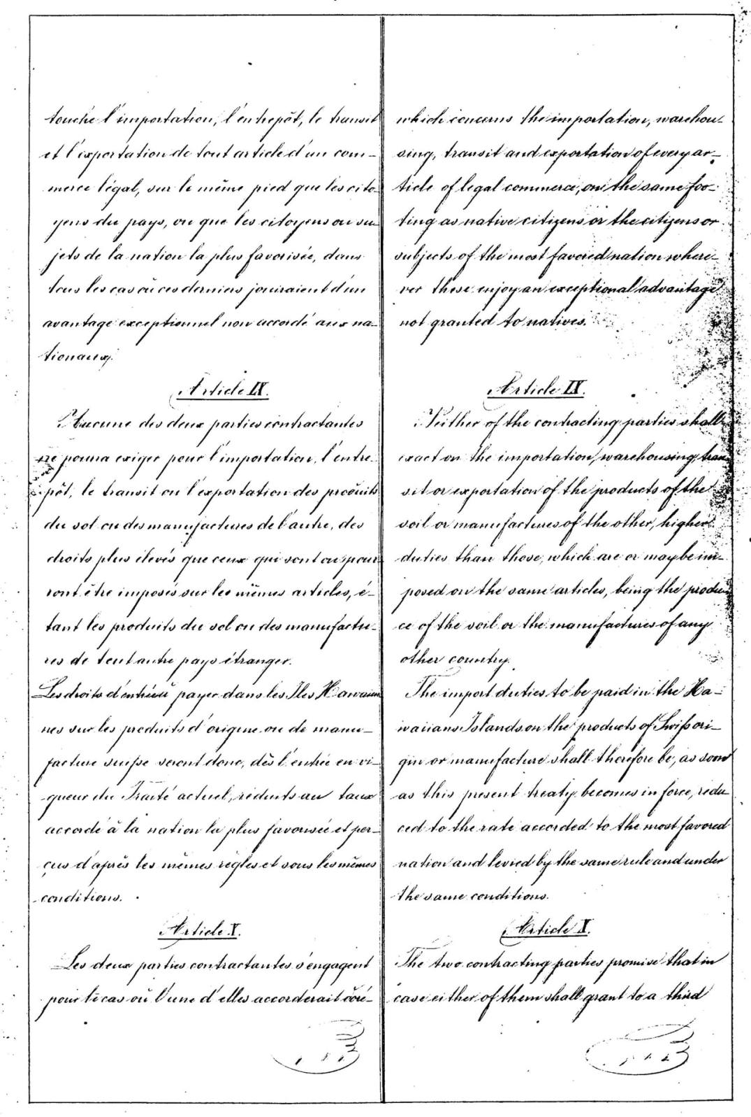 Die beiden kontrahirenden Theile verpflichten sich, die beidseitigen Bürger in allem, was die Einfuhr, die Niederlage, den Transit und die