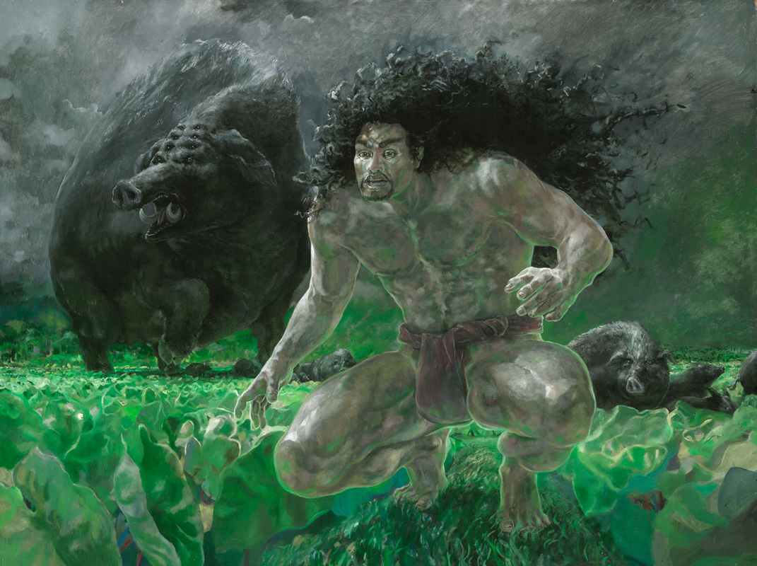 Kamapuaa, the fabulous being referred to, seems, according to the tradition, to have possessed the power of transforming himself into a hog, in which capacity he committed all manner of depredations upon the possessions of his neighbors. He having stolen some fowls belonging to Olopana, who was the King of Oahu, the latter, who was then living at Kaneohe, sent some of his men to secure the thief. They succeeded in capturing him, and having tied him fast with cords, were bearing him in triumph to the King, when, thinking they had carried the joke far enough, he burst the bands with which he was bound, and killed all the men except one, whom he permitted to convey the tidings to the King. This defeat so enraged the monarch that he determined to go in person with all his force, and either destroy his enemy, or drive him from his dominions. He accordingly, despising ease inglorious,