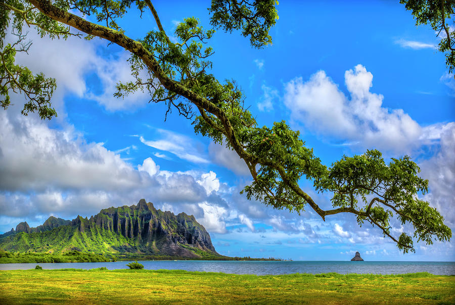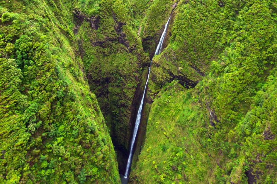 The valley runs back some two miles, terminating abruptly at the foot of the precipitous chain of mountains which runs nearly the whole length of the windward side of Oahu, except for a narrow gorge which affords a channel for a fine brook that descends with considerable regularity to a level with the sea. Leaving his horse at the termination of the valley and entering this narrow pass of not over fifty or sixty feet in width, the traveller winds his way along, crossing and recrossing the stream several times, till he seems to be entering into the very mountain. The walls on each side are of solid rock, from two hundred to three hundred, and in some places four hundred feet high, directly overhead, leaving but a narrow strip of sky visible.
