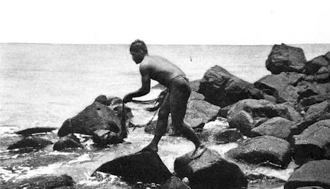 When the canoes had proceeded far out he located his position by landmarks; and looking down into the sea, and finding the right place, he told the paddlers to cease paddling. Standing up in the canoe and taking one of the stones in his hands he dived into the sea. Its weight took him down rapidly to the bottom, where he saw a big cave opening right before him, with a number of fishes scurrying about the entrance, such as uluas and other deep sea varieties. Feeling assured thereby that the puhi was within, he arose to the surface and got into his canoe. Resting for a moment, he then opened the gourd and took out the hook manaiaakalani and tied the hau rope to it. He also picked up a long stick and placed at the end of it the hook, baited with a preparation of cocoanut and other substances attractive to fishes. Before taking his second dive he arranged with those on the canoe as to the signs to them of his success. Saying this, he picked up the other stone and dived down again into the sea; then, proceeding to the cave, he placed the hook in it, at the same time murmuring a few incantations in the name of his parents. When he knew that the puhi was hooked he signalled, as planned, to tell those on the canoe of his success. In a short while he came to the surface, and entering the canoe they all returned to shore, trailing the rope behind. He told those in the canoe from Haneoo to paddle thither and to Hamoa, and to tell all the people to pull the puhi; like instructions were given those on the Aleamai canoe for their people. The two canoes set forth on their courses to the landings, keeping in mind Aiai’s instructions, which were duly carried out by the people of the two places; and there were many for the work.